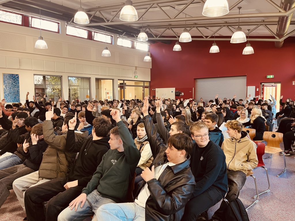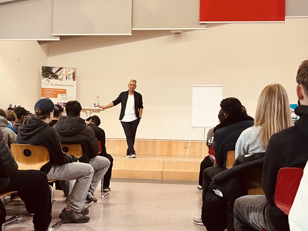 Die Grundidee war es, Jugendliche mit unterschiedlichen sozialen und kulturellen Hintergründen zu erreichen und ihnen zu verdeutlichen, dass sie durchaus selber ihre Lebenssituation und vor allem Perspektiven ändern können, wenn sie sich als selbstwirksam erleben. Wir wollten die Schule als Ort erlebbar machen, an dem Vielfalt geschätzt und Zukunft aktiv gestaltet werden kann. Mit dem Projekt „voll motiviert“ durch den Jugendcoach Osman Citir sahen wir die Möglichkeit dies an unserer Schule durchführen zu können, ohne den “pädagogischen Zeigefinger” von Lehrkräften und soz.päd. Fachkräften. Das Programm “voll motiviert” von Herrn Citir richtet sich an Schülerinnen und Schüler mit unterschiedlichen sozialen und kulturellen Hintergründen und spiegelt somit die damit verbundene Herausforderung in Bezug auf Vorurteile, Diskriminierung und Orientierungslosigkeit entsprechend unserer Schülerschaft sehr gut wieder. Es verfolgt das Ziel, sie in demokratischen und gesellschaftlichen Kompetenzen zu stärken, Vorurteile abzubauen, Respekt und Toleranz zu fördern und die Eigenverantwortung zu stärken. Am 03.11.2025 fand diese Veranstaltung für insgesamt 241 Schülerinnen und Schüler (125 männlich, 116 weiblich) der Klassen 8-10 in der Mensa unserer Schule statt. Das Programm teilte sich in drei Teile auf, beginnend um mit einem 100-minütigen Bühnenprogramm, darauf folgten zwei jeweils 60-minütige interaktive Coachings und anschließenden Einzel- bzw. Kleingruppengespräche. Durch das 100-minütige Bühnenprogramm wurden die Schülerinnen und Schüler emotional angesprochen und für die Themen Diskriminierung, Vorurteile, Respekt und Miteinander sensibilisiert. Herr Citir, selbst Kind einer türkischen Gastarbeiterfamilie, sprach offen über eigene Erfahrungen auch seinem Leben, seiner Schulzeit und Einstieg in sein Berufsleben und schaffte es durch Humor, Authentizität und Nähe zur Lebenswelt der Jugendlichen einen direkten Zugang zu diesen zu bekommen. In den anschließenden zwei Live-Coachings a 60 Minuten setzen sich die SuS in interaktiven Gesprächsrunden vertieft mit den vorher gegebenen Impulsen auseinander. Die Schülerinnen und Schüler wurden ermutigt, ihre eigene Haltung zu hinterfragen, sich aktiv in das Coaching einzubringen, um so dann perspektivisch selbstwirksam erfahren zu können, ihren weiteren Lebensweg selbstbewusst und mit sozialer Verantwortung gestalten zu können. Während das Bühnenprogramm hauptsächlich die Aufmerksamkeit der Schülerinnen und Schüler geweckt hat und für wichtige gesellschaftliche Themen sensibilisiert hat, dienten die Coachings der Vertiefung, persönlicher Reflexion und der Entwicklung konkreter Handlungsmöglichkeiten. Viele der SuS suchten im Anschluss noch das persönliche Gespräch mit Herrn Citir. Die Schülerinnen und Schüler wurden darin bestärkt, sich mit ihrer eigenen Haltung gegenüber Vielfalt, Vorurteilen und Ausgrenzung auseinanderzusetzen. Gleichzeitig sollen sie erkennen, dass sie Verantwortung für ihr Umfeld übernehmen und ihre Zukunft selbstwirksam mitgestalten können – mit Haltung, Respekt und einem klaren Blick für gesellschaftliche Zusammenhänge. Das Spiegeln ihres Verhaltens durch Herrn Citirs Bühnenprogramm, bei dem er u.a. immer wieder verschiedene Typen von Schülerinnen und Schüler darstellte, zeigte diesen auf eine humor- und vor allem respektvolle Art und Weise, wie sie sich oftmals verhalten und wurde von der gesamten Schülerschaft sehr schnell als nicht angemessen erkannt, egal ob im Kontext Schule, Praktikum, Peergroup oder Familie. Er zeigte Ihnen auf, welche anderen Optionen im Umgang mit dem Gegenüber möglich sind, wie man diese umsetzen und was man damit erreichen kann. Das Projekt „Voll motiviert – Zukunft mit Perspektive“ wurde als Highlight wahrgenommen, was nicht belehrt, sondern bewegt. Die Verbindung aus Humor, Lebensnähe und echter Begegnung schaffte einen hohen emotionalen Zugang, der für unsere Schülerinnen und Schüler besonders ansprechend war. Während des Programms und auch im anschließenden Coaching konnte man sehr gut erkennen, dass sich die Schülerinnen und Schüler von Herrn Citir abgeholt und vor allem verstanden gefühlt haben. Sie zeigten sich im Bühnenprogramm locker und gelöst, lachten viel, zeigten sich aber auch emotional berührt. Sie waren selbst für diesen langen Zeitraum von knapp 4 Zeitstunden konzentriert und stellten insbesondere in den beiden interaktiven Coachings immer wieder Fragen und blieben thematisch “am Ball”. Die methodische Umsetzung und die Erfahrung von Osman Citir sorgten dafür, dass der Ablauf auch mit dieser großen Gruppe sicher, strukturiert und wirkungsvoll durchgeführt werden konnte. Herr Citir hat es geschafft 241 Schülerinnen und Schüler vom ersten Moment an in seinen “Bann zu ziehen”. Sprach einzelne von ihnen bereits vor Beginn des Programms an, band diese und andere immer wieder namentlich ein und holte sie somit immer wieder ab, wenn sie abschweiften. Er hatte einen hochprofessionellen Blick auf die gesamte Schülerschaft und setzte diese z.B. bei Störungen in einer so emphatischen und nicht wertenden Art und Weise um, dass diese ihr “Fehlverhalten” gar nicht als solches wahrnahmen, sondern das Umsetzen auf einen anderen Sitzplatz als neue Chance empfunden haben. Herr Citir schaffte es in kürzester Zeit einen emotionalen Zugang zu den Schülerinnen und Schülern zu finden, ihre Aufmerksamkeit zu wecken und sie schnell für wichtige gesellschaftliche Themen wie Respekt, Fairness, Miteinander, Vorurteile und Diskriminierung zu sensibilisieren. Aufgrund seines eigenen Migrationshintergrundes gab es sofort eine Verbindung zu unseren Schülerinnen und Schülern, von denen knapp 40% einen Migrationshintergrund haben. Aber nicht nur durch dies, sondern insbesondere durch seine wertschätzende Art und Weise hat er es geschafft, diesen Aktionstag an der Anne-Frank-Schule Fritzlar zu einem